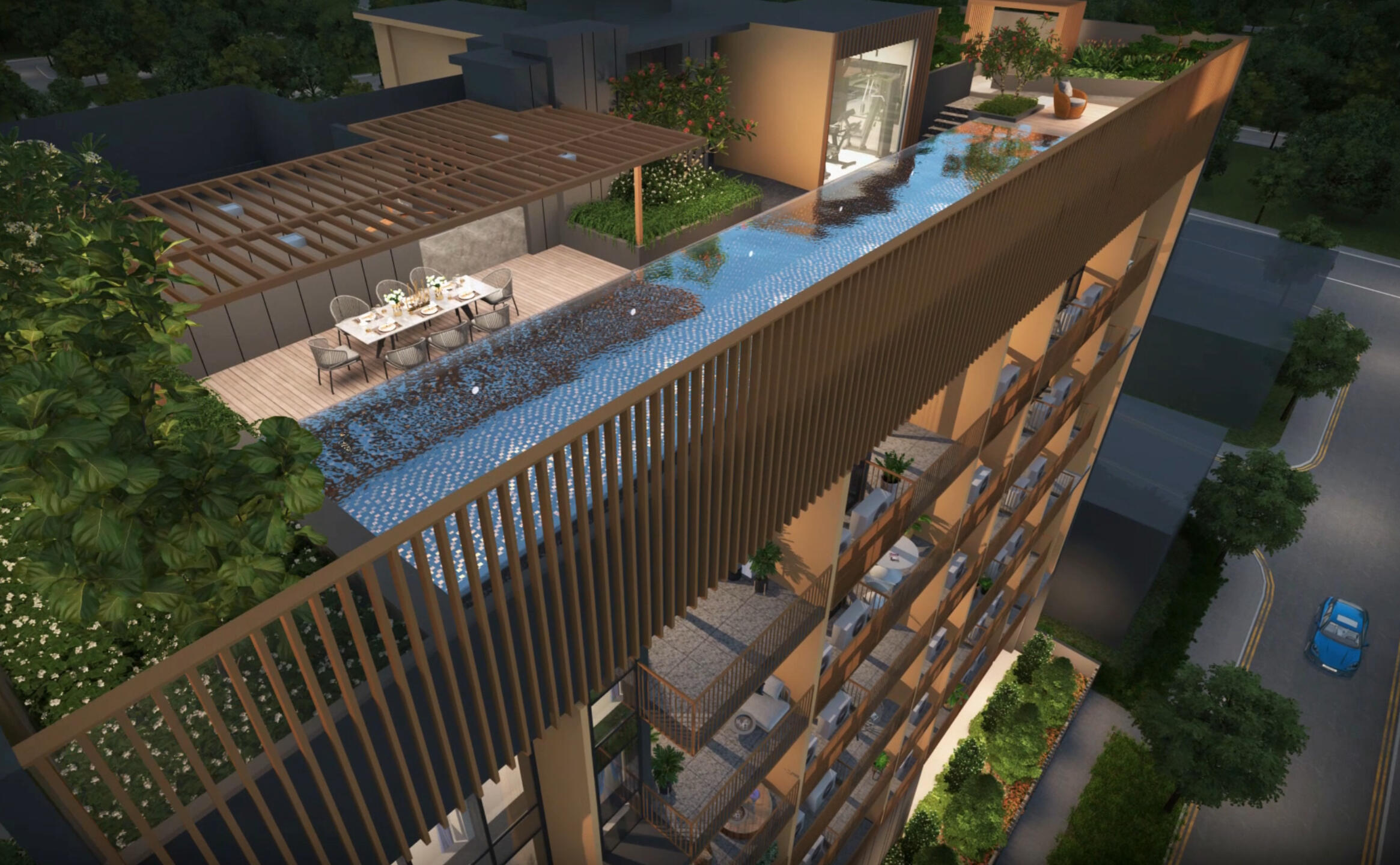 shophouses. At 7-storey high, the unique residential stands above the surrounding shophouses as it